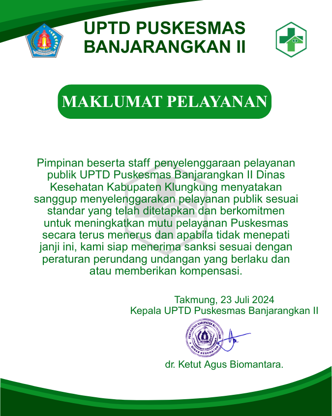 “Pimpinan beserta staff penyelenggara pelayanan publik UPTD Puskesmas Banjarangkan II Dinas Kesehatan Kabupaten Klungkung menyatakan sanggup menyelenggarakan pelayanan publik sesuai standar yang telah ditetapkan dan berkomitmen untuk meningkatkan mutu pelayanan Puskesmas secara terus menerus dan apabila tidak menepati janji ini, kami siap menerima sanksi sesuai dengan peraturan perundang-undangan yang berlaku dan/atau memberikan kompensasi.”